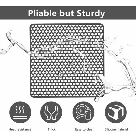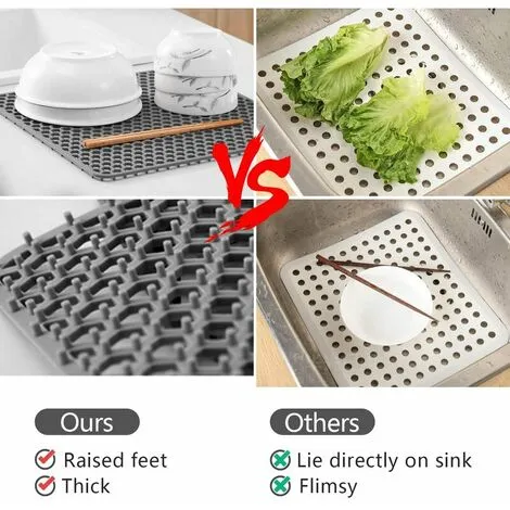 The silicone material is flexible and bendable. Our sink mat would conform to a slight curve on the side of the sink, suitable for sinks no larger than 13.5 x 13.5 inches. The silicone sink mat will cushion the sudden force if dishes or bowls fall into the sink. Good protection for your fragile glassware and your stainless steel or ceramic sink. Raised, non-slip feet elevate the sink mat to allow small food particles and water to pass through. Also works as a dish drying mat under the sink. Our kitchen sink protector can withstand up to 500F so you can safely place pans and dishes in the sink or porcelain counter directly from the oven or stove. Another advantage of the silicone material is that it is rustproof, it will be more durable if cleaned periodically. 【Warm Tips】 Package: 1 x Silicone Sink Protector. Irregular patterns can hold food residue effectively but will be a bit difficult to clean. It is recommended to clean the sink protector periodically to prevent too much waste from piling up. Before buying, please make sure the size of the sink for a perfect choice.