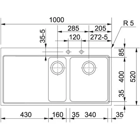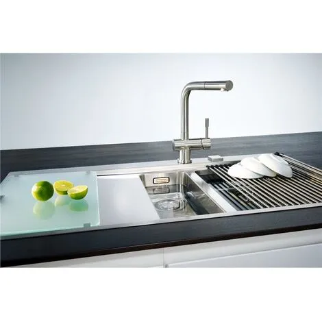 2 x 90mm basket strainer waste, Overflow and fittingsStainless steel strainer bowl Technical Overall size W1000 x D520 x H175(mm)Large bowl size W340 x D400 x H175(mm)Small bowl size W160 x D400 X H175(mm)Worktop Cut out required W991 x D511(mm)Minimum base unit 600(mm)  50 year guarantee  * Tap, glass chopping board and roll mat not included – For illustration purposes only.